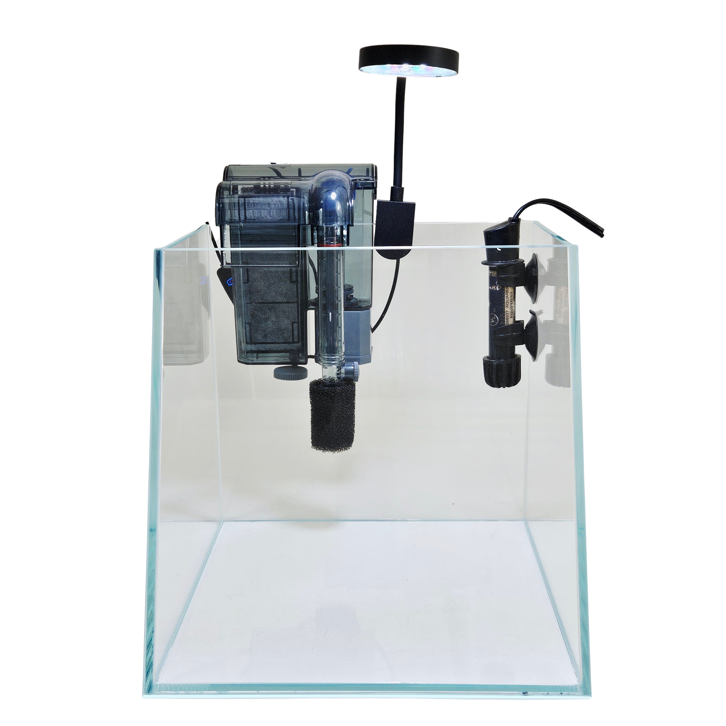 Kit Includes: HOF-10 Hang on Filter, Heater, USB Full Spectrum LED Light, Algae scrub pad base insulation pad.