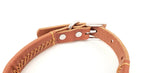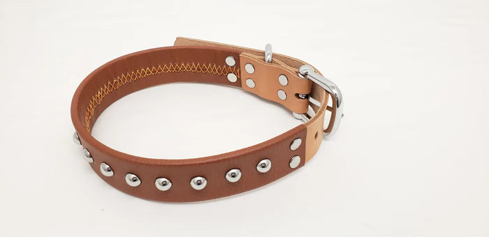 Leather Dog Collar with Single Line of Silver Chrome Buttons. Two tone color of Light Brown and Dark Brown combination for Medium size dogs. Made of high quality leather with excellent craftmanship.