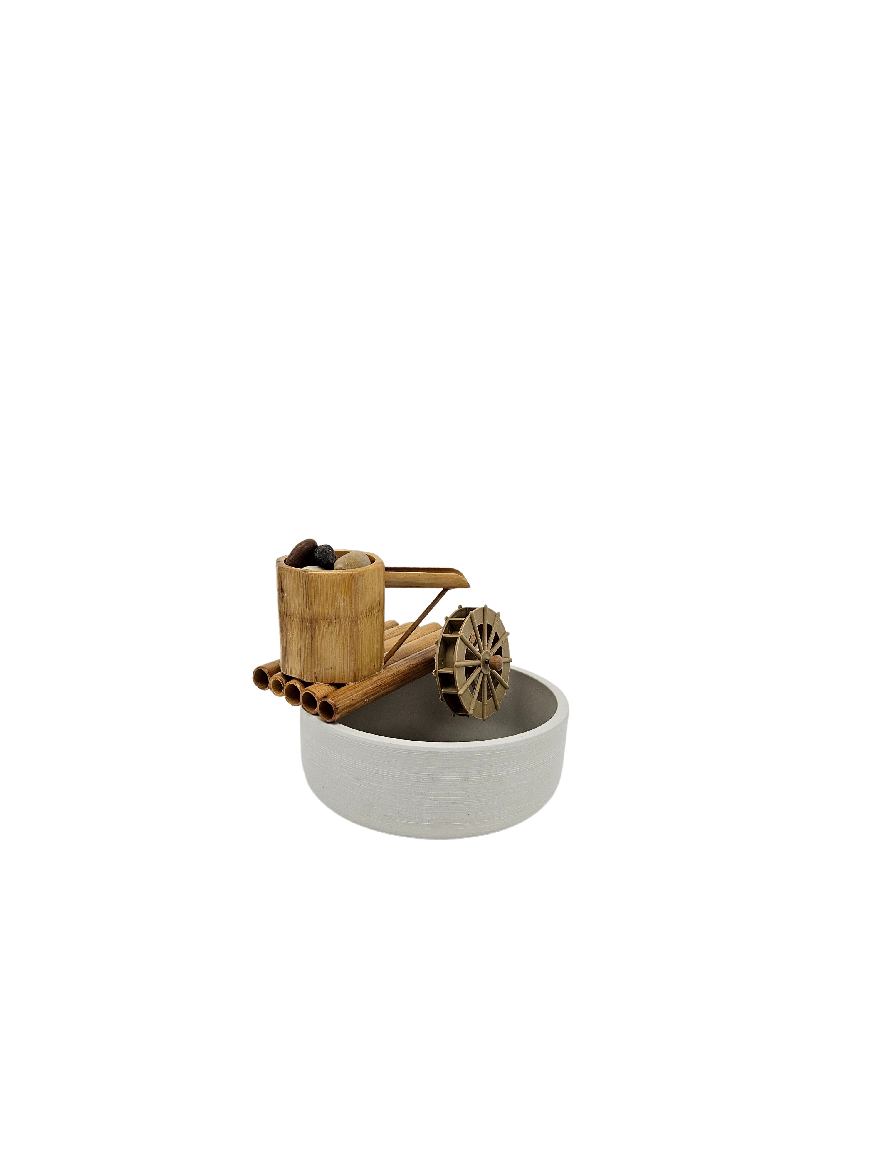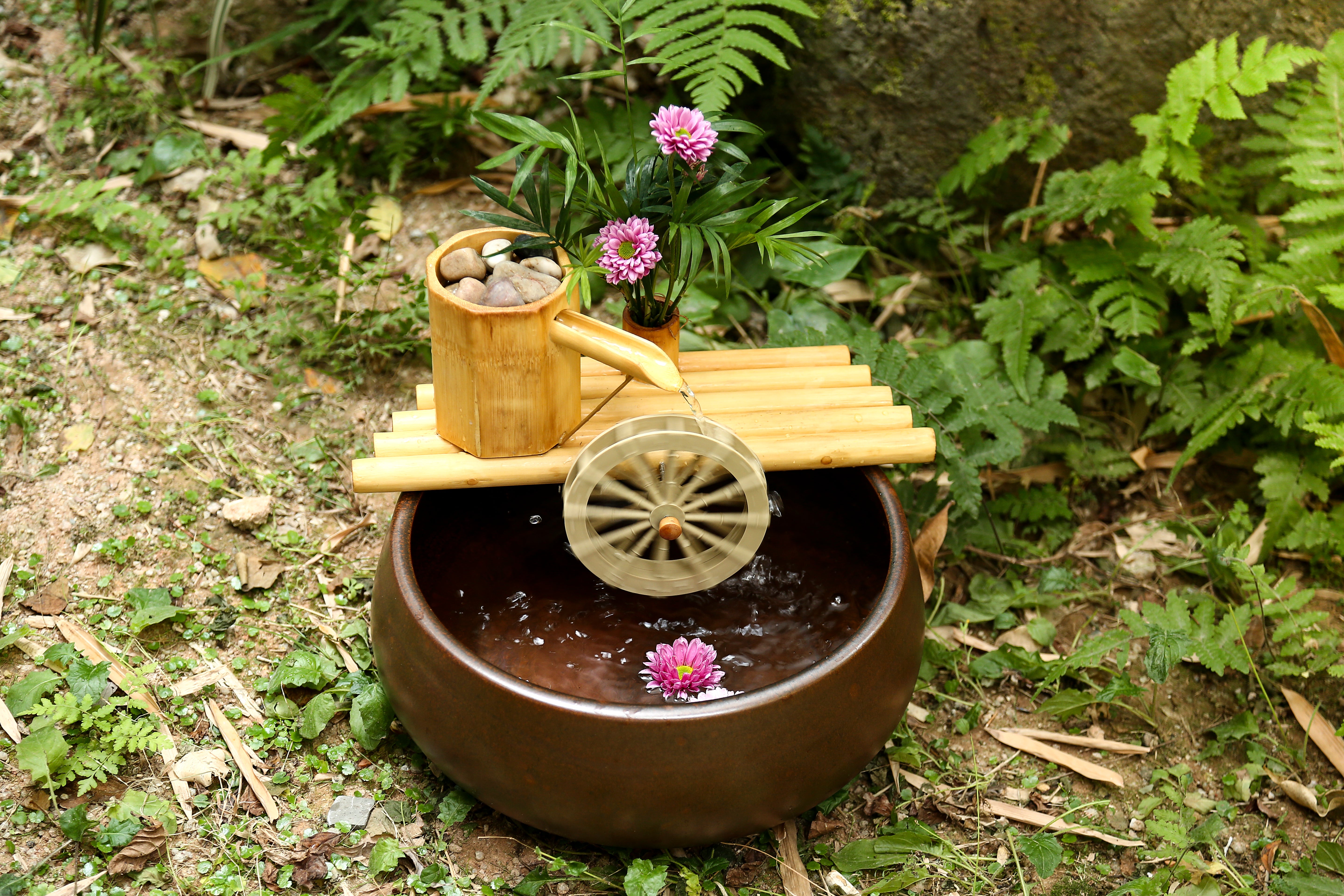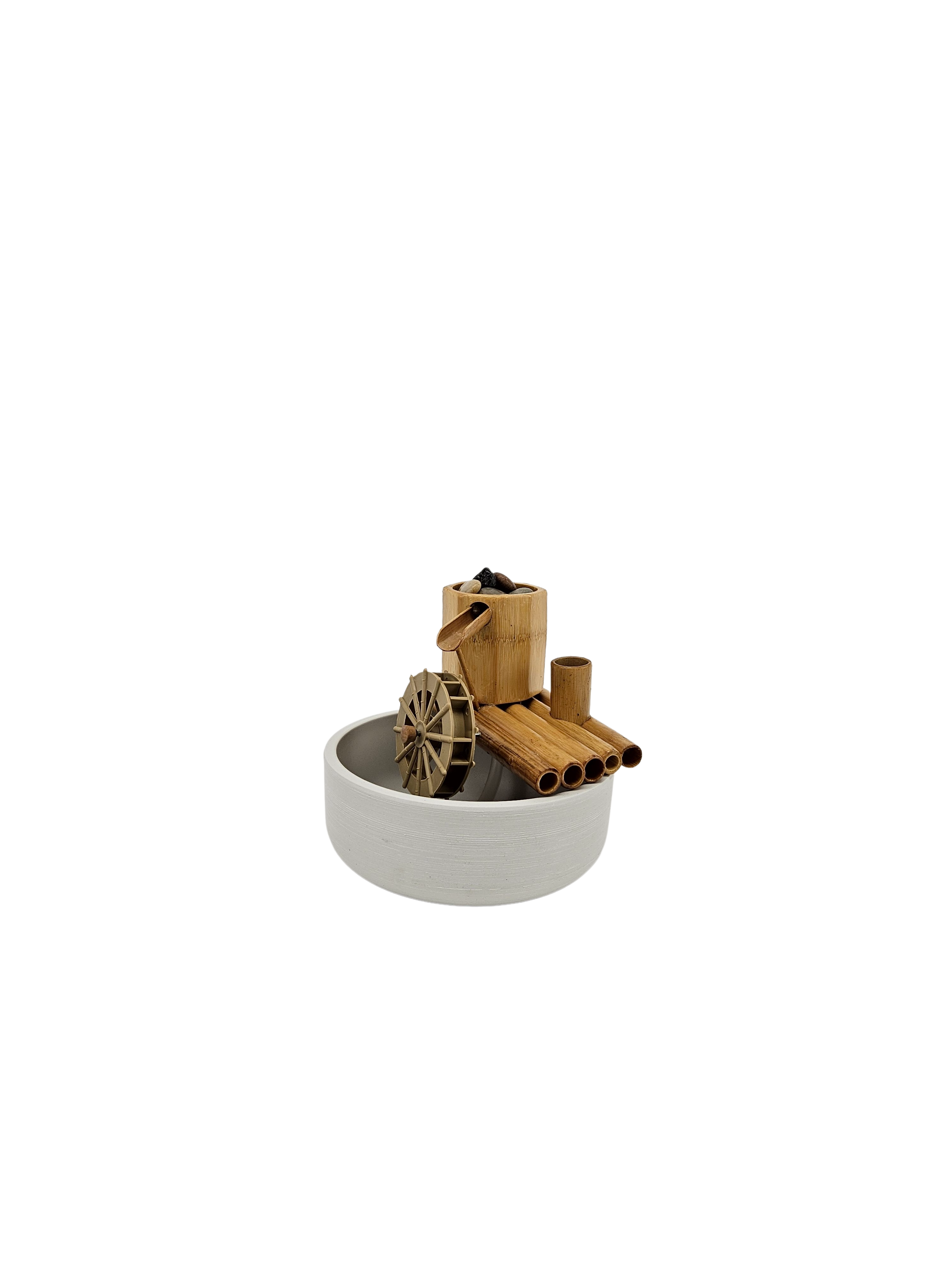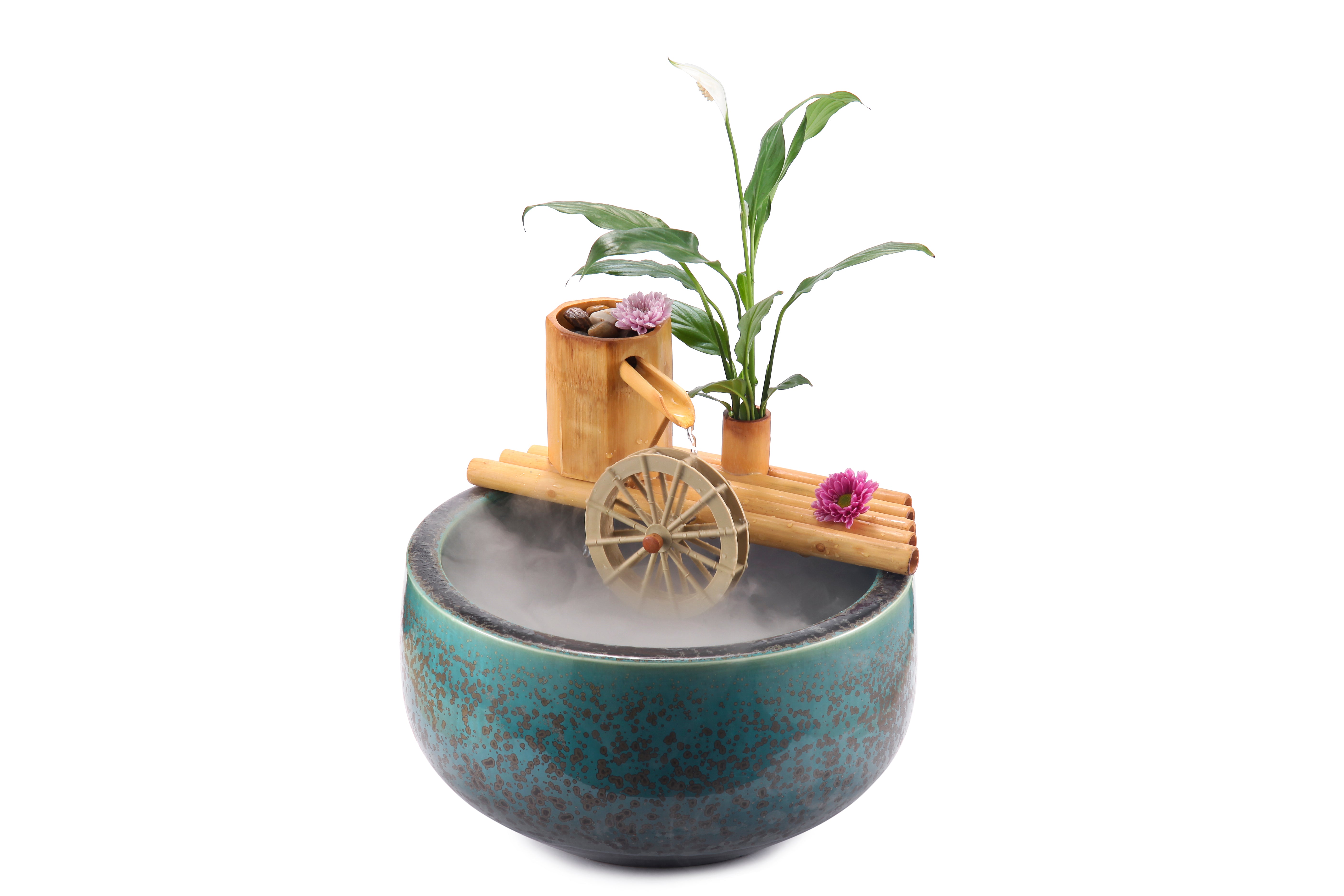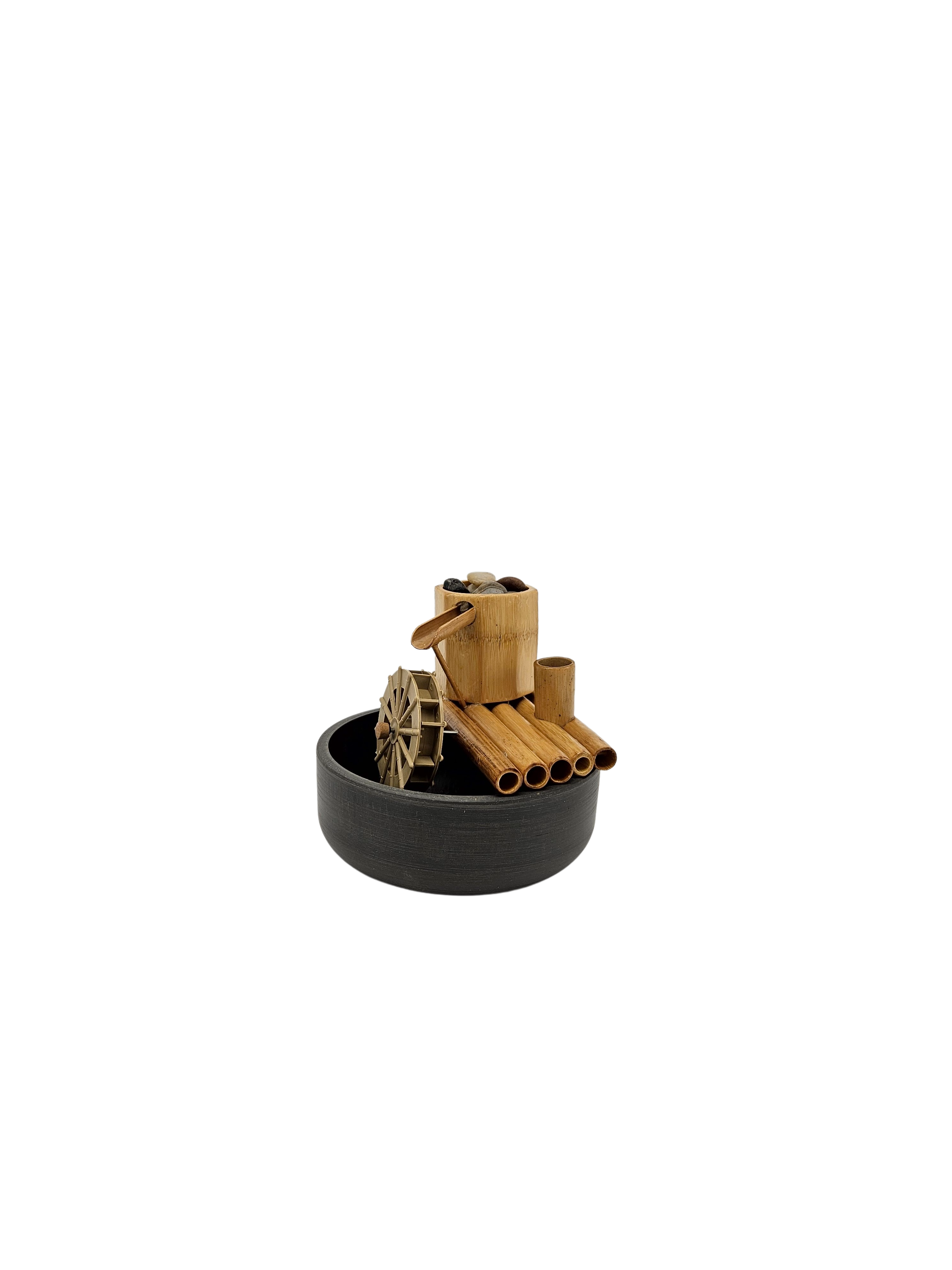 Designed to provide serenity and tranquility of the sound of water owing gently indoors, on a balcony or porch, or outside in a landscaped backyard. Choose your favorite location or container and create any look or sound. Some colorful pots in the photos are for show only.