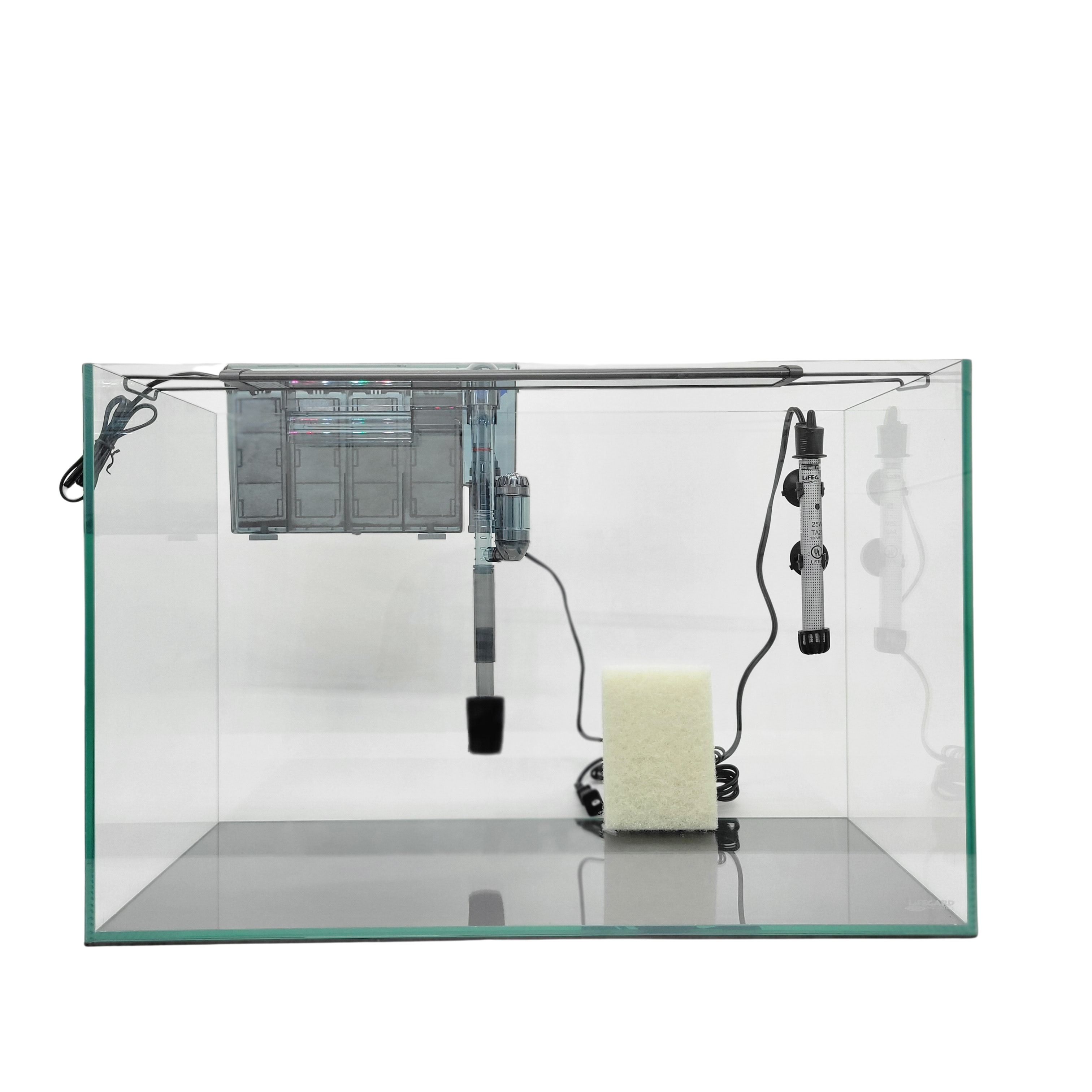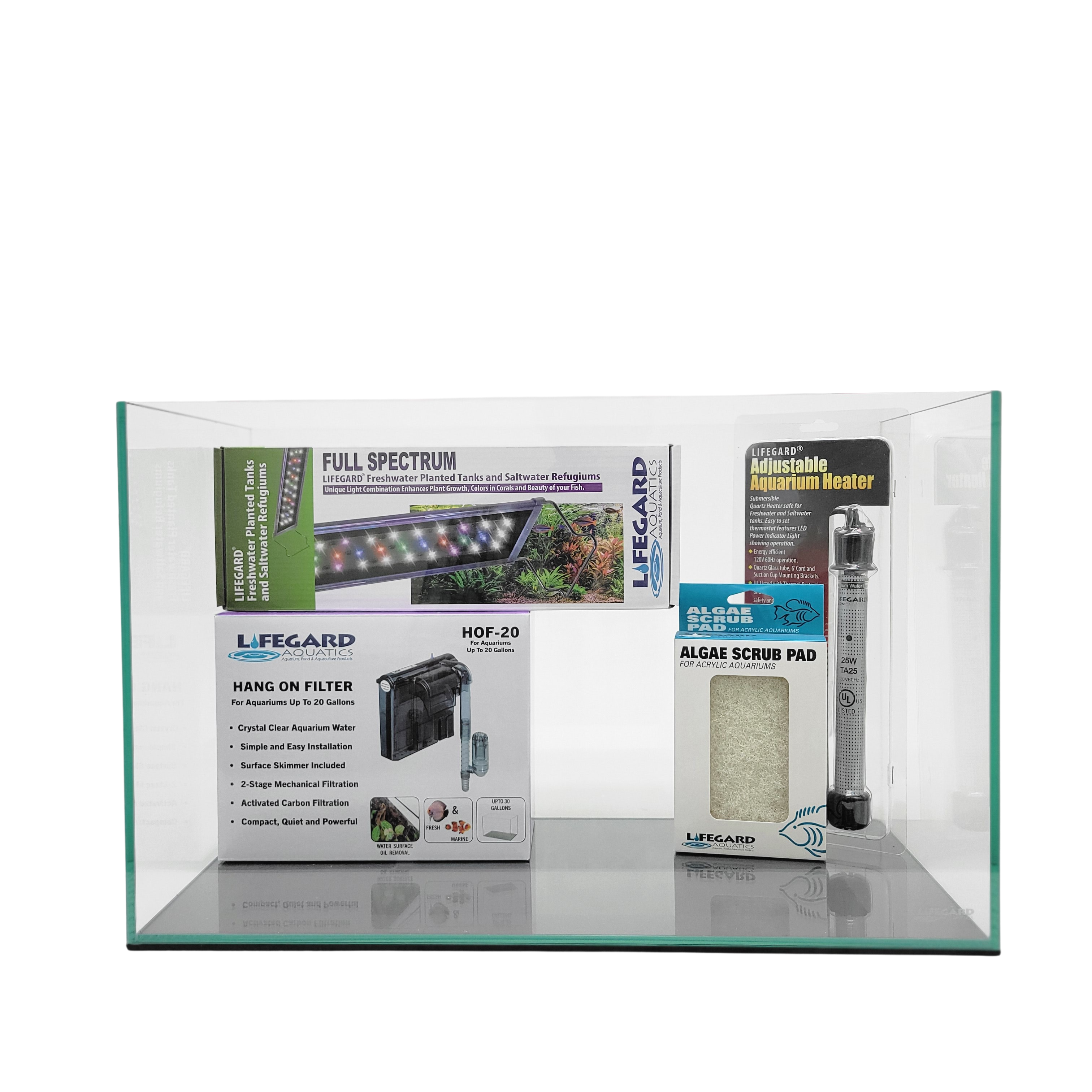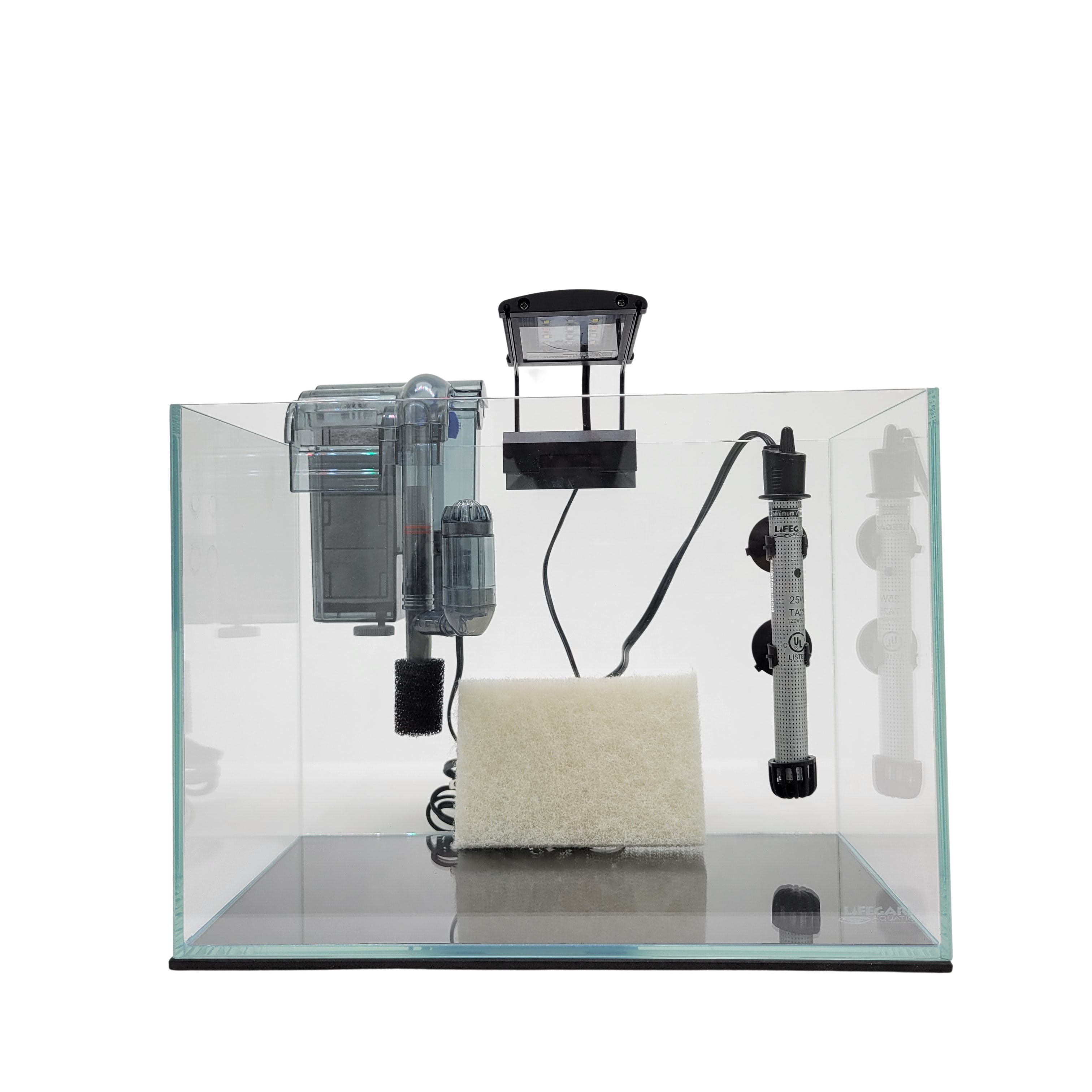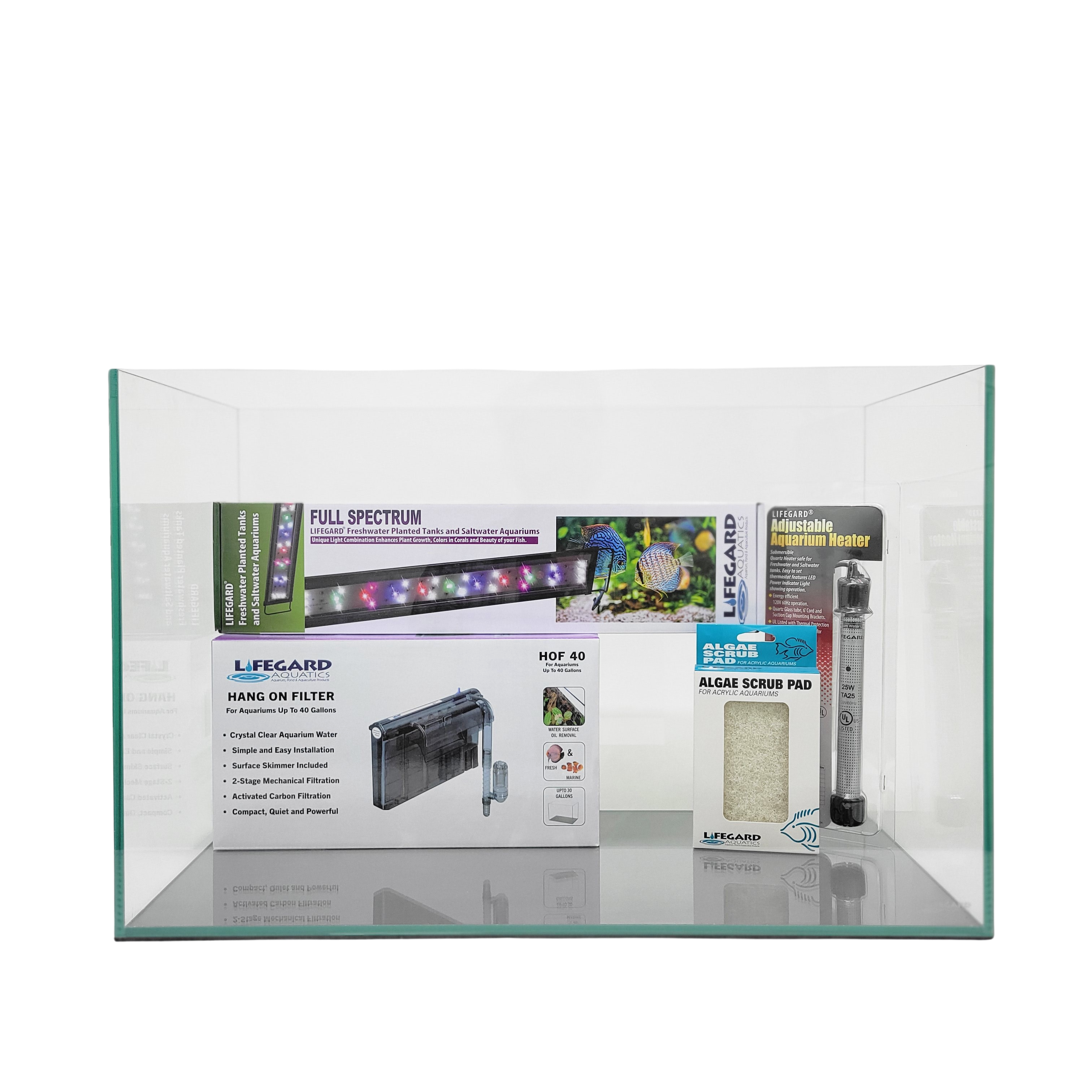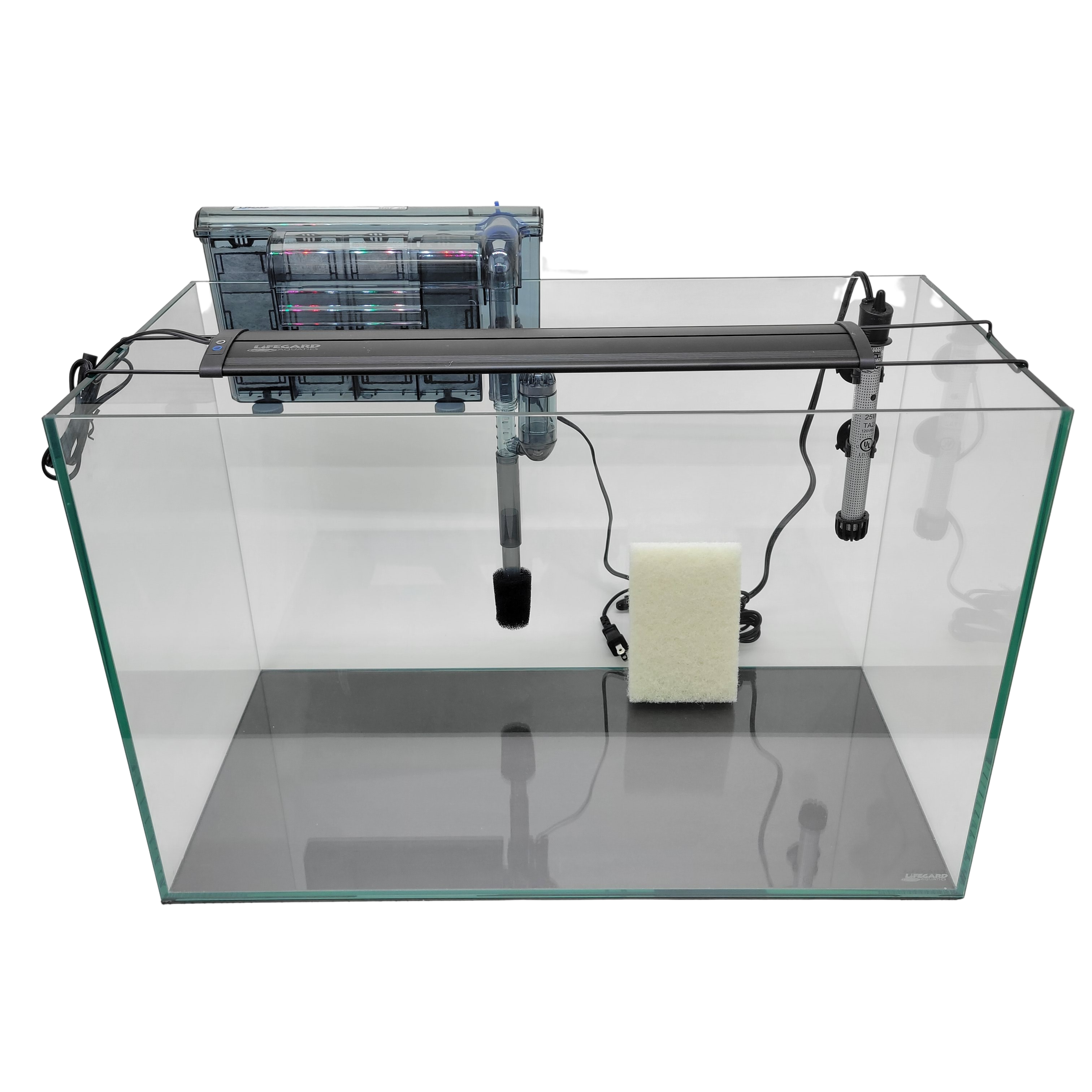 LIFEGARD® Clear Glass Rimless Aquarium Kit - Includes: Full Spectrum LED Light, Quad Hang-On Slim Low Profile Filter, Heater and a Algae Scrub Pad, Ultra Clear Glass with Polished Edge and Insulation Pad