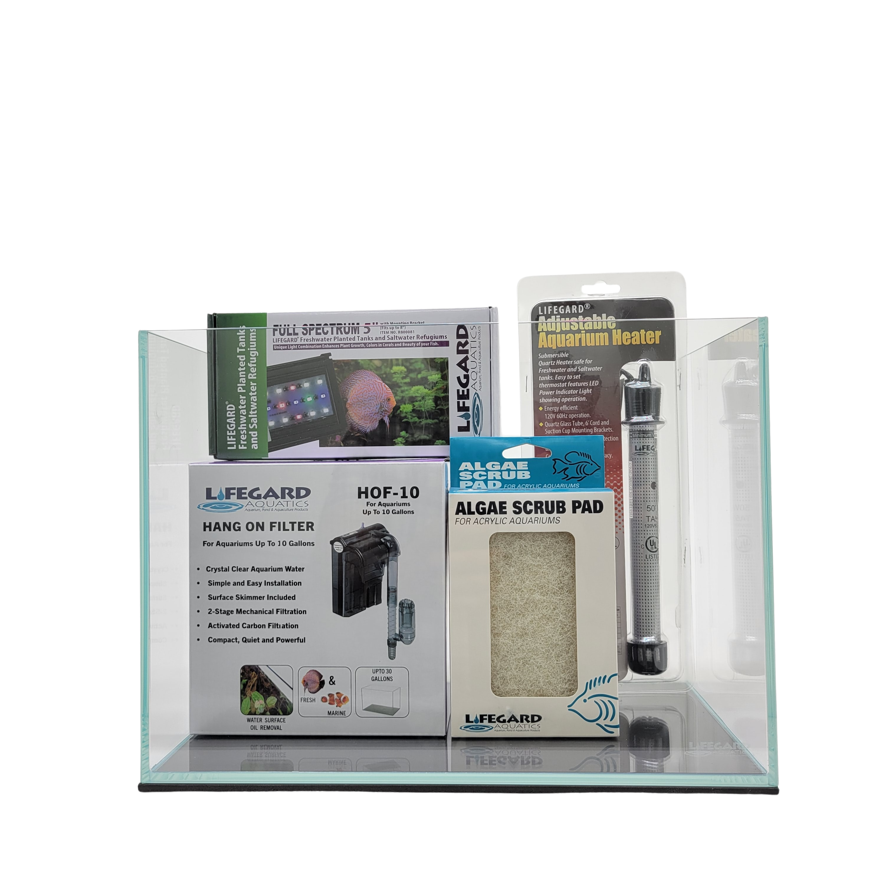 10 Gallon Clear Glass Rimless Aquarium 5mm - Kit Includes Hang on Filter, Full Spectrum LED Light, Mounting Bracket, Heater, Algae Scrub Pad |