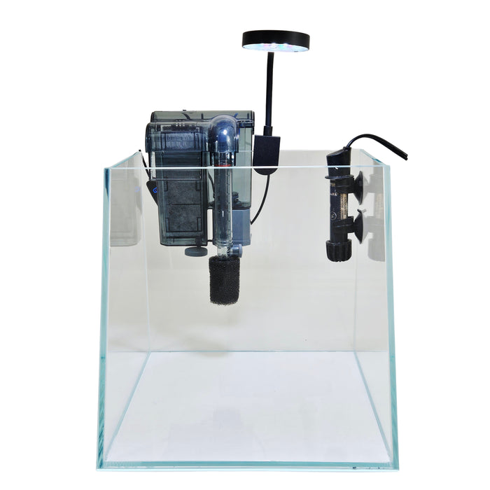 Kit Includes: HOF-10 Hang on Filter, Heater, USB Full Spectrum LED Light, Algae scrub pad base insulation pad.